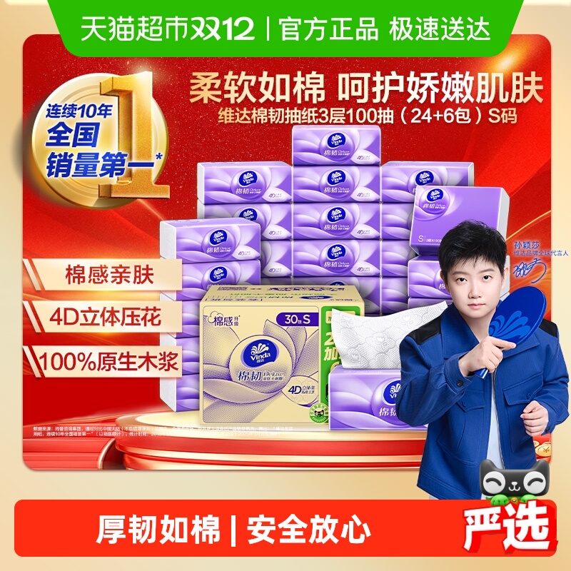 【孙颖莎推荐】维达棉韧压花抽纸3层S码家用纸巾实惠整箱装