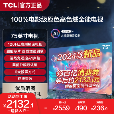 百亿补贴TCL电视 75英寸 120Hz高刷 2+32GB 4K超高清高色域平板电视