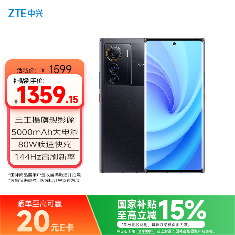 自营中兴(ZTE)Axon 50 骁龙8+ 144Hz高刷 6400万三摄 12GB+512GB曜金黑 单系统 5G拍照手机