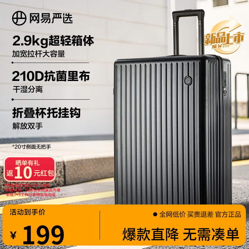 自营网易严选超轻大容量行李箱加厚耐磨出差拉链拉杆箱墨玉黑20英寸【可登机】