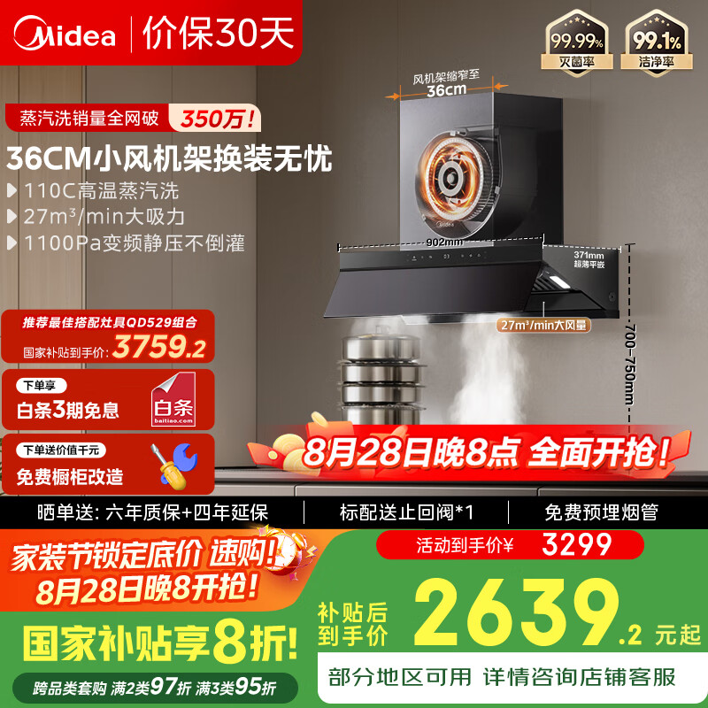 自营美的(Midea)【蒸汽洗AK7PRO M 换装版】抽油烟机家用27风量顶侧一体自清洁高温蒸汽洗齐平橱柜变频吸脱排烟机