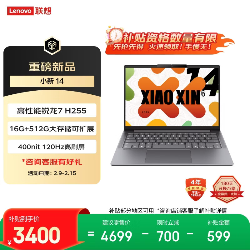自营联想小新14 14英寸轻薄笔记本电脑(锐龙R7-H255 16G 512G 高色域 400nit 120Hz高刷)