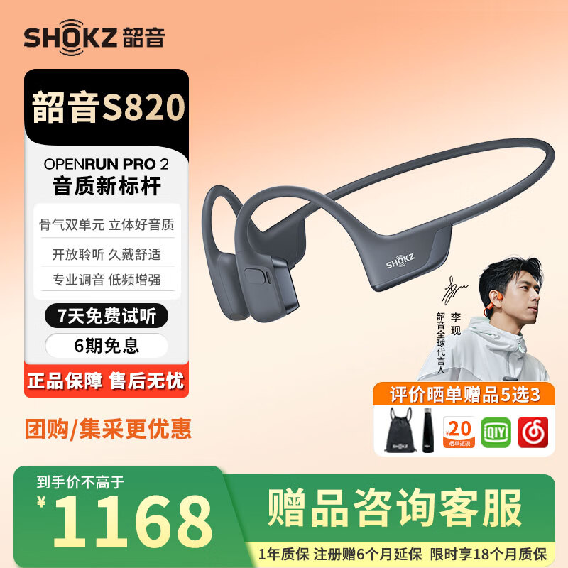 旗舰店SHOKZ 韶音【李现同款】OpenRun Pro 2 S820骨传导耳机无线开放式蓝牙耳机主动降噪防尘抗汗跑步运动健身耳机 砂石黑-京仓 快至当/次日达