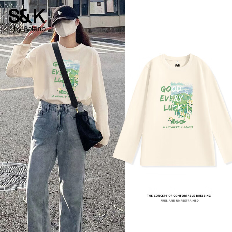 旗舰店班尼路BALENOS&K100%纯棉长袖T恤女2025年春秋女装新款田园风休闲简约百搭上衣 杏#绿色花草 L