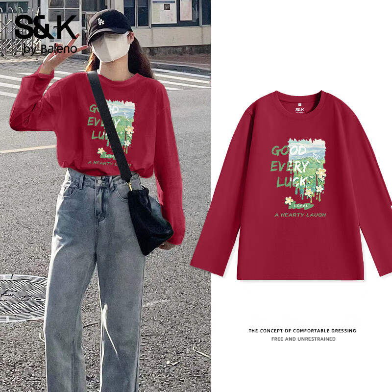 旗舰店班尼路BALENOS&K100%纯棉长袖T恤女2025年春秋女装新款田园风休闲简约百搭上衣 车厘子红#绿色花草 M