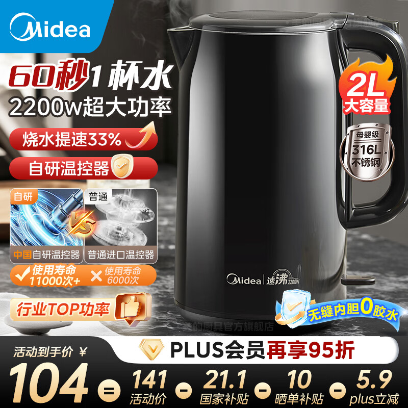 旗舰店美的2200w大功率电热水壶电烧水壶全自动一体 2升大容量电水壶烧水家用316L不锈钢一体无缝内胆煮茶壶 2L 【2200w速沸 60秒1杯水】25年新品
