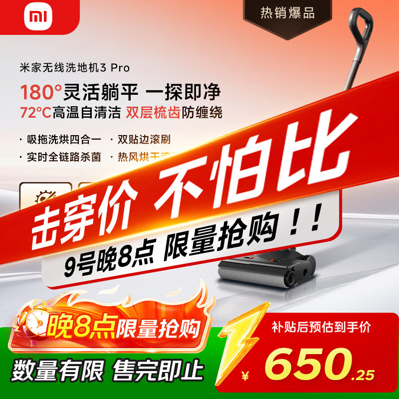 自营米家小米无线洗地机3Pro 扫地吸拖一体180°躺平全链杀菌 高温热洗热烘自清洁防缠绕洗地机