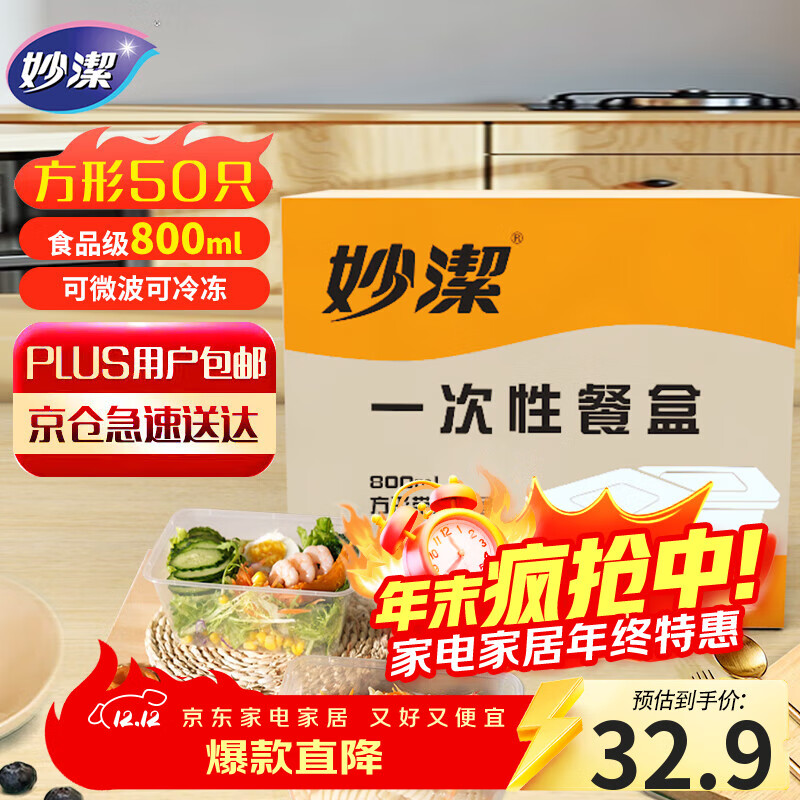 自营妙洁一次性饭盒 方形带盖800ml*50只 食品级野餐打包汤碗筷可微波加热