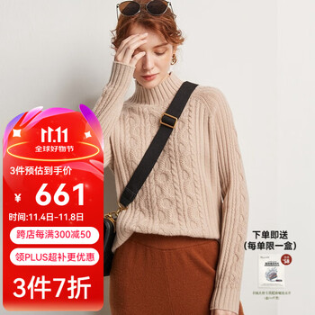 旗舰店雅鹿羊毛衫女100%纯羊毛2025新款高领纯色时尚毛衣秋冬季打底针织衫 卡其色 L