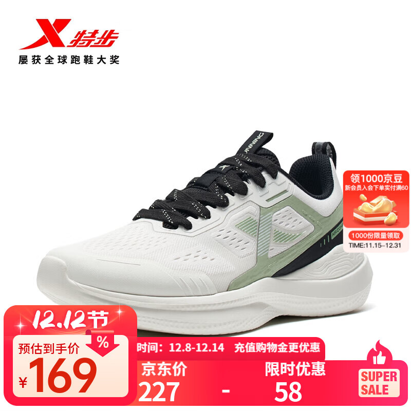 旗舰店特步柔立方跑步鞋男舒适耐磨回弹集训跑鞋舒适透气轻盈男鞋户外鞋 帆白/山岚绿 44