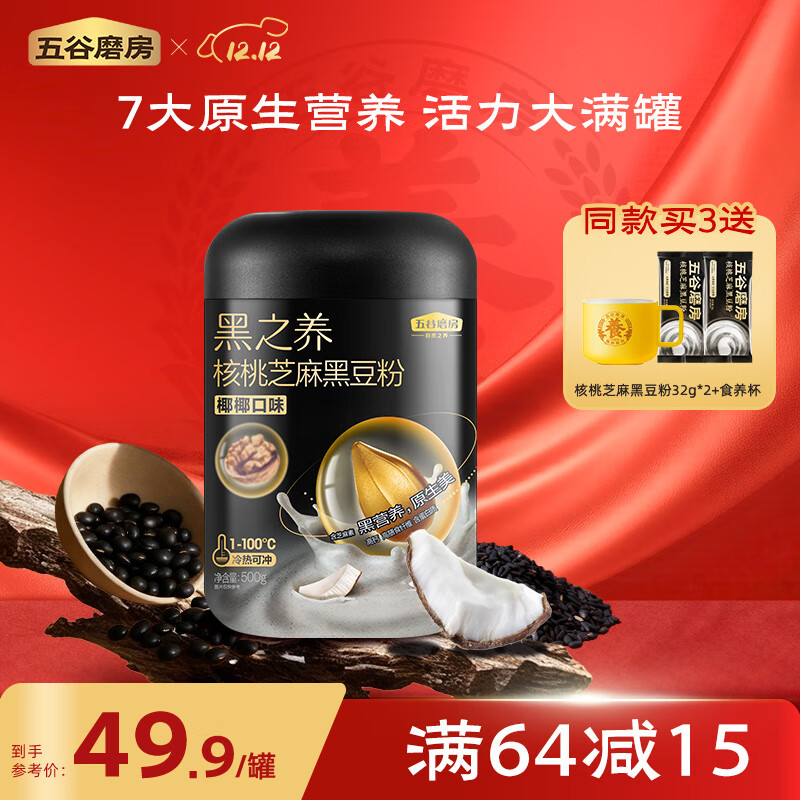 自营五谷磨房黑芝麻糊核桃芝麻黑豆粉黑之养代餐粉500g椰椰口味