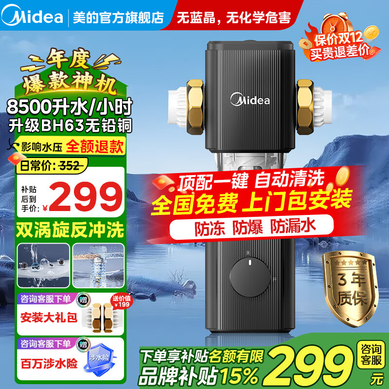旗舰店美的前置过滤器家用8.5T大通量反冲洗40微米双网防爆自来水过滤 全屋净水器净水机过滤器自动清洗 【一键自动清洗】QZBW20S-80