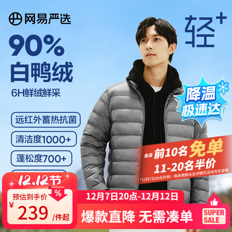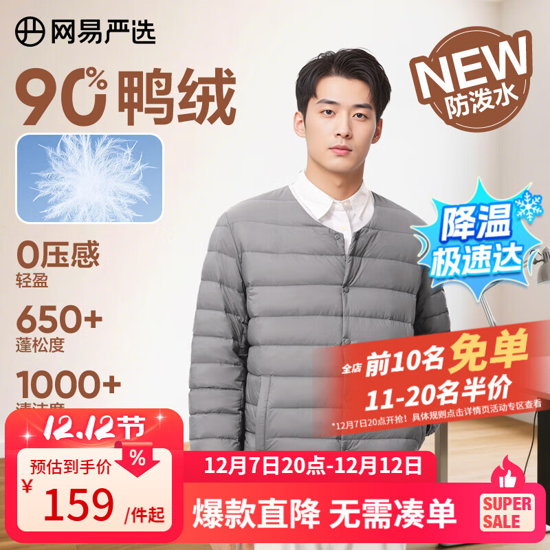 旗舰店网易严选【轻+7.0pro】90白鸭绒轻薄羽绒服排骨羽绒服云感保暖抗菌 立领*幻影灰 2XL
