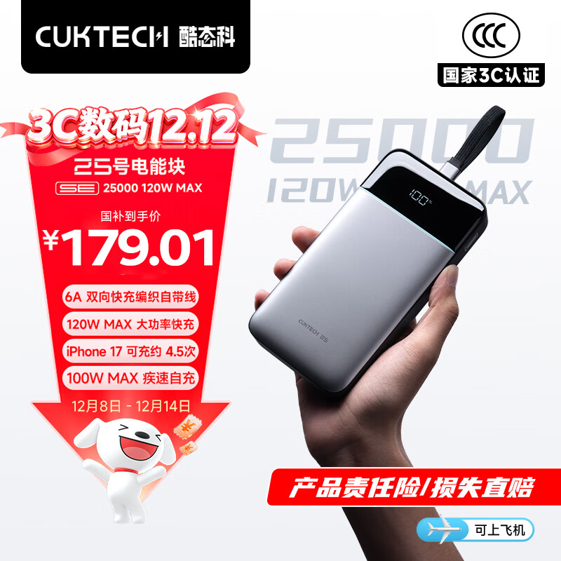 自营CUKTECH酷态科【3C认证可上飞机】25号超级电能块SE充电宝120W自带线25000毫安时移动电源适用苹果17小米