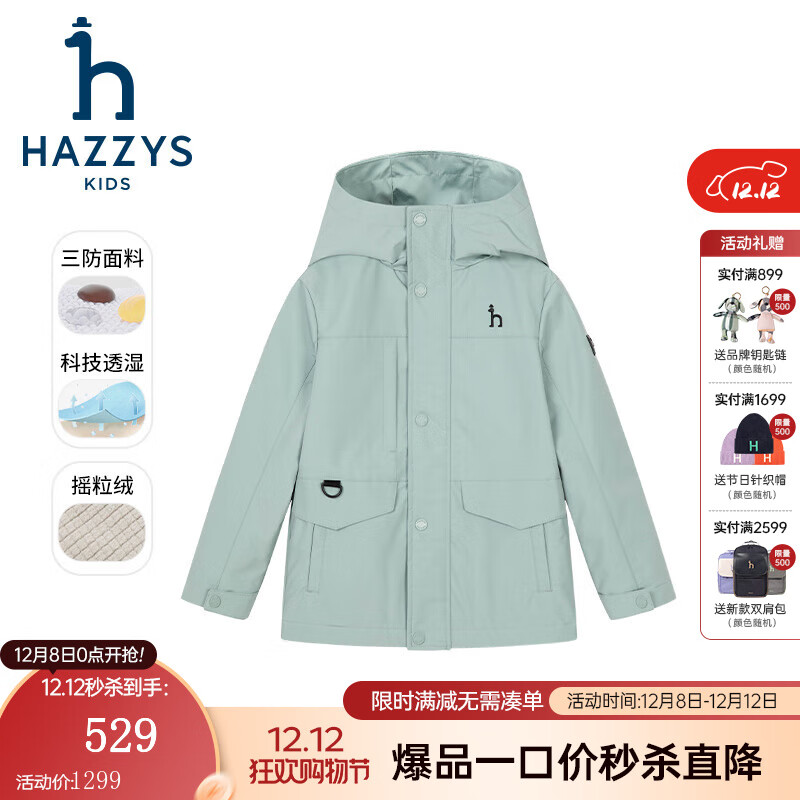 旗舰店哈吉斯(HAZZYS)童装男童风衣秋季新款三防透湿加绒连帽厚外套 天青色 145