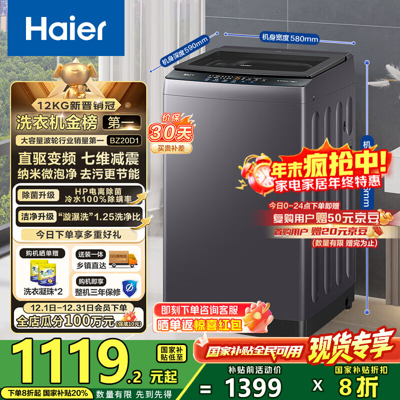 旗舰店海尔(Haier)波轮洗衣机全自动懒人家用12公斤大容量直驱变频一级能效除菌漩瀑洗1.25洗净比 BZ20D1国家补贴20%