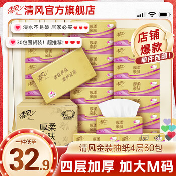 百亿补贴清风抽纸纸巾4层30包加大M码面巾纸餐巾纸擦手纸卫生纸家用批发整箱 【加大M码囤货装】 4层 75抽*30包