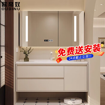 百亿补贴欧帝奴(OUDINU)智能浴室柜 卫生间奶油风陶瓷一体盆洗手洗脸盆柜卫浴洗漱台 组合 智能镜柜-陶瓷盆带配件 80cm