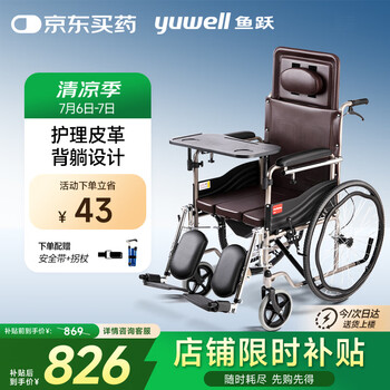 自营鱼跃(yuwell)护理型轮椅车H059B老人半躺型带坐便器椅餐板钢管可折叠