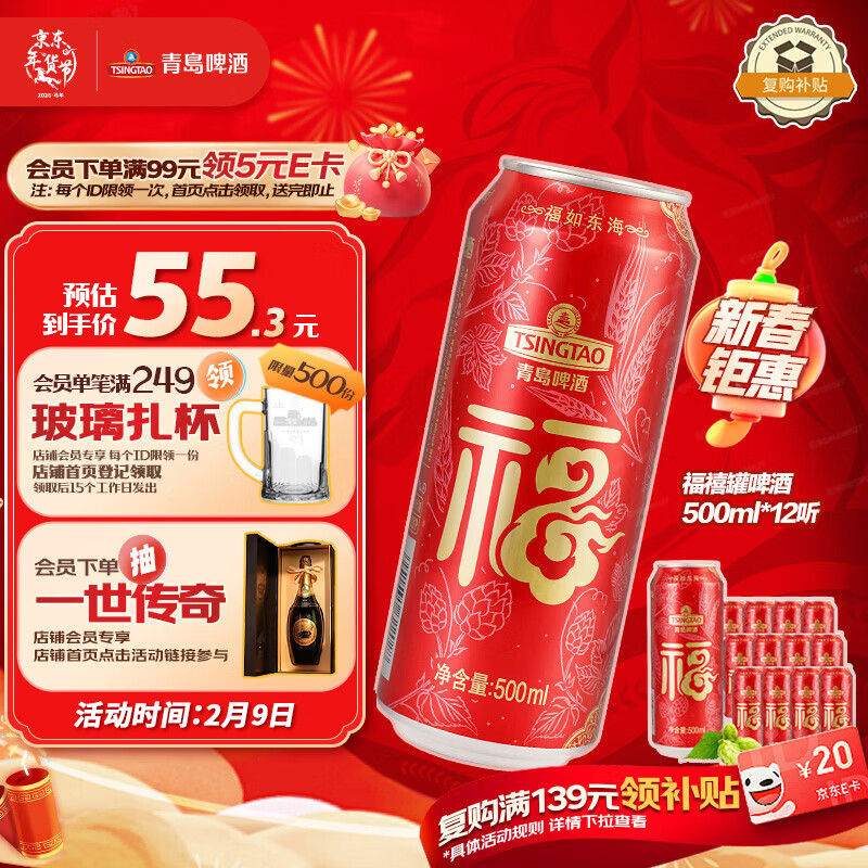 自营青岛啤酒(TsingTao)福禧罐吉祥福气红罐 500ml*12听 整箱装 年货送礼