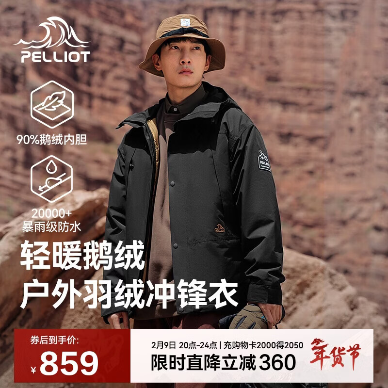 自营伯希和(Pelliot)[成毅同款]山海羽绒三合一冲锋衣男女鹅绒保暖外套12240128黑XL