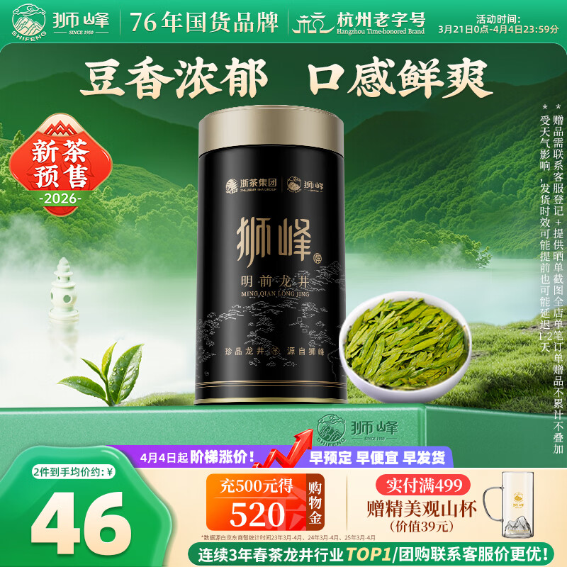 自营狮峰牌2026年新茶预售绿茶龙井茶叶明前特级50g罐装送礼自己喝春茶