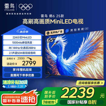 自营FFALCON雷鸟 鹤6 25款 65英寸MiniLED电视 家电国家补贴 288Hz 4+64GB 一级能效智能电视机65S595C鹤625款