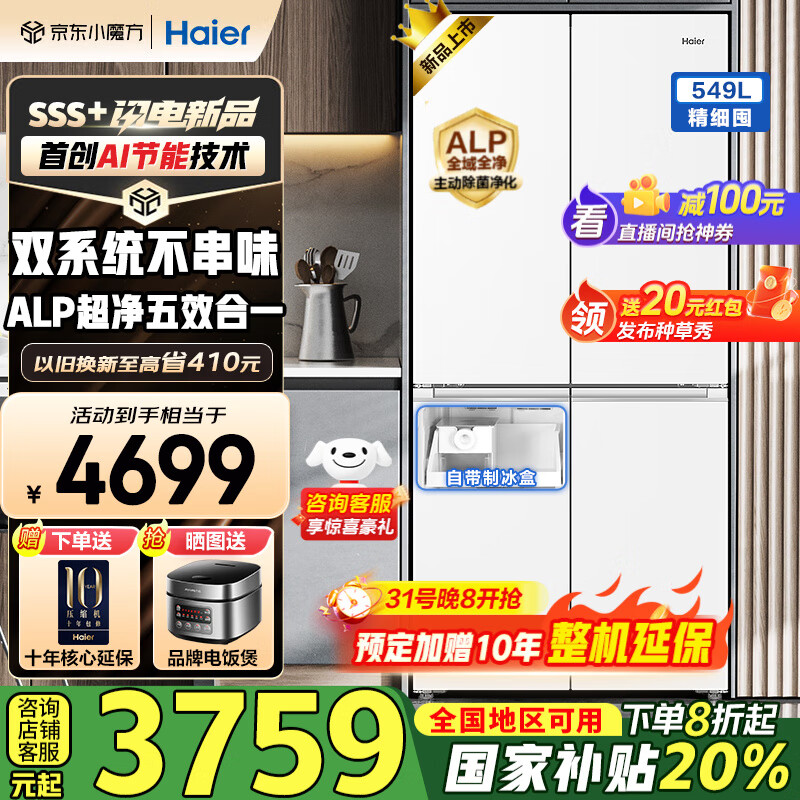 旗舰店海尔(Haier)【新品】冰箱549升十字对开门四开门双系统防串味ALP超净系统家用一级能效风冷无霜带制冰国补20% 549升+智控双系统+超净五效合一+冷藏冷冻双除菌