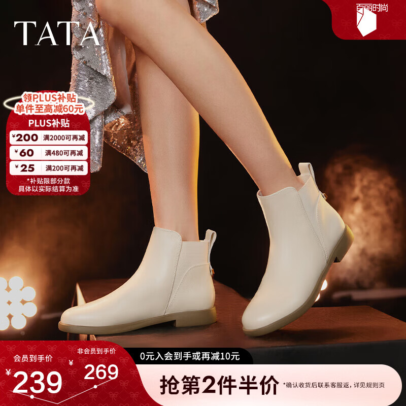旗舰店他她(TATA)法式通勤短靴女靴白色加绒牛皮踝靴子单靴秋冬新7BJ44DD3 米白(单里) 35