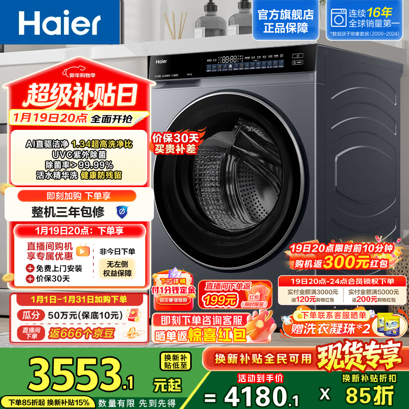 旗舰店海尔(Haier)(Haier)云溪4.0洗衣机 525直驱大筒径 活水精华洗1.34高洗净比 12kg大容量 一级能效 BLEU582HU1