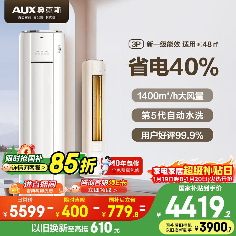 自营奥克斯空调 省电侠 大3匹 新一级能效变频冷暖铜管空调 客厅防直吹柜机 国家补贴 KFR-72LW/BpR3GQS1(B1)