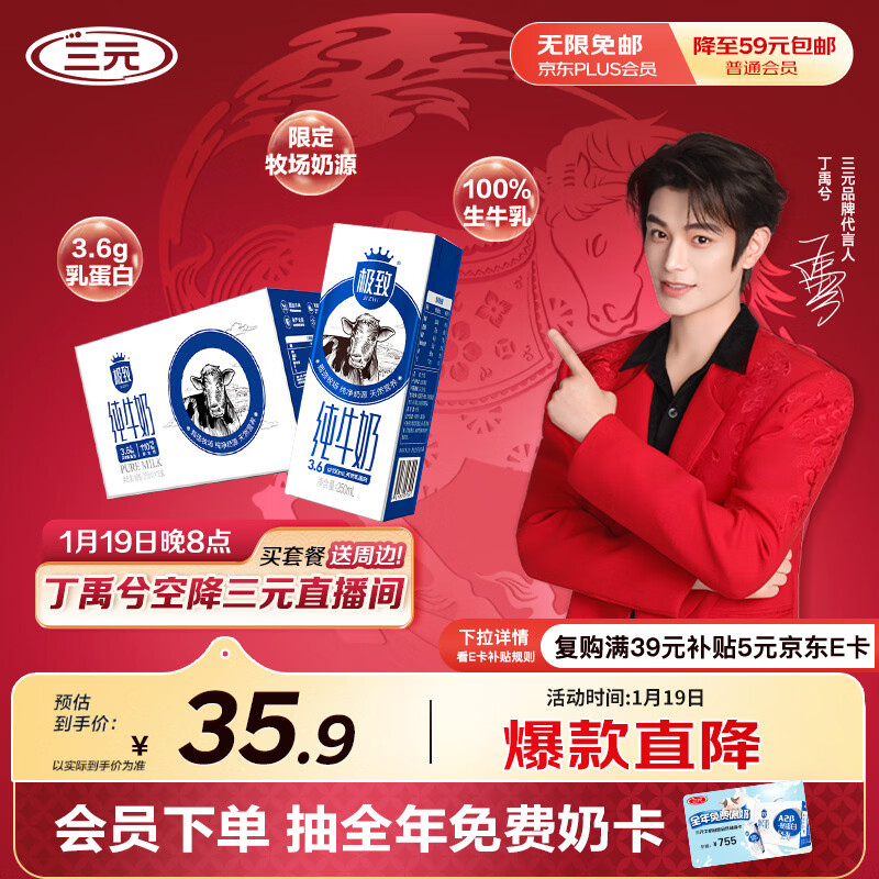 自营三元极致高品质全脂纯牛奶整箱250ml*16盒3.6g乳蛋白 9-10月产