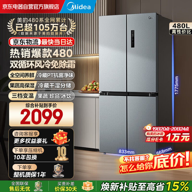 自营美的(Midea)慧鲜系列480升变频一级能效十字四开门双开对开门风冷冰箱BCD-480WSPZM(E)焕新补贴