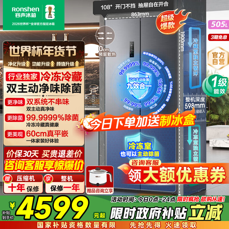 旗舰店容声方糖505主动除菌双系统十字四开门超薄零嵌入式电冰箱家用制冰一级能效BCD-505P60CZMAD灰国家补贴 世界杯【60cm真零嵌底部散热】【主动除菌2.0】