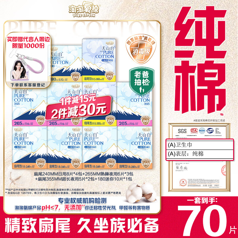 自营淘淘氧棉天山白消毒级卫生巾纯棉扇尾含迷你日夜组合10包70片
