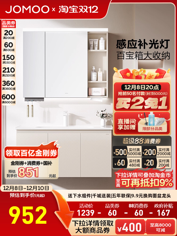百亿补贴【百亿补贴】九牧奶油风简约浴室柜洗手卫生间洗漱台陶瓷一体盆
