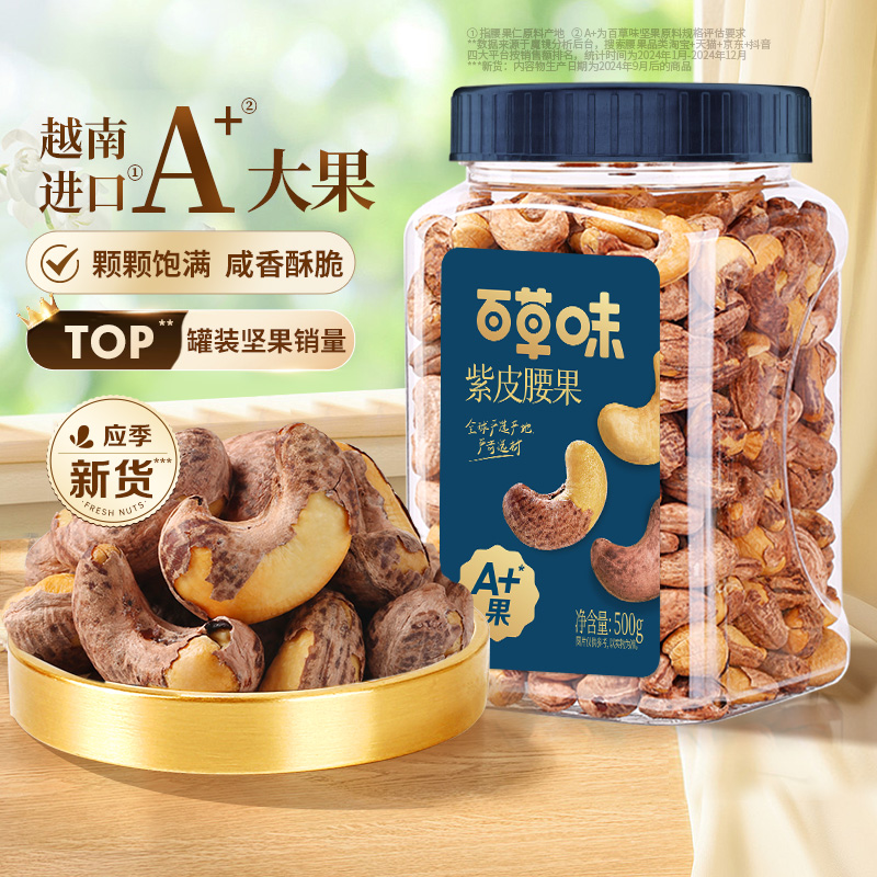 旗舰店百草味罐装紫皮腰果仁500g坚果仁干果盐焗味坚果休闲食品健康解馋