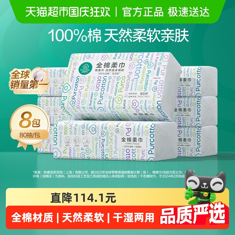 全棉时代洗脸巾纯棉柔巾洁面巾抽取式干湿两用美容擦脸巾80抽8包