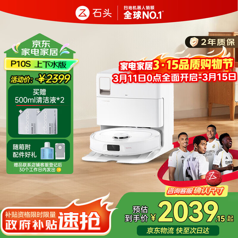 自营石头P10S扫地机器人扫拖一体 自动上下水版 自动清洗复洗复拖 洗地机智能烘干【国家补贴】A10000RR