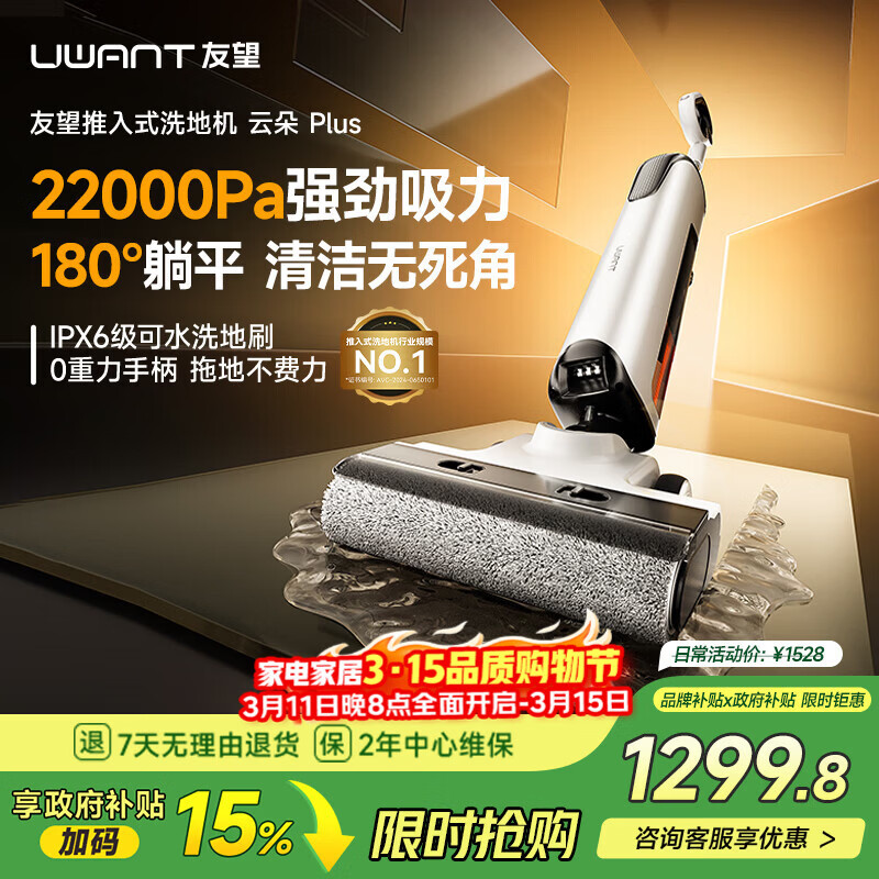 自营UWANT友望洗地机云朵Plus【 0重力手柄 推入式】超薄躺平 家用洗吸拖一体自动清洗拖地机电动拖把