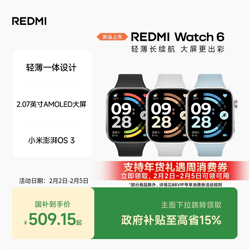 旗舰店红米手表6 REDMI Watch6 小米智能手表运动跑步长续航蓝牙通话血氧心率高清大屏红米手表5升级款