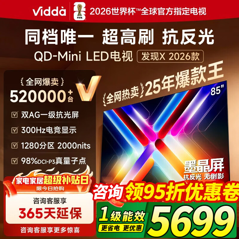 旗舰店Vidda发现X 2026款85英寸 300Hz超高刷 墨晶屏 QD-Mini LED 国家补贴海信电视世界杯定制电视85VX5Q 85英寸