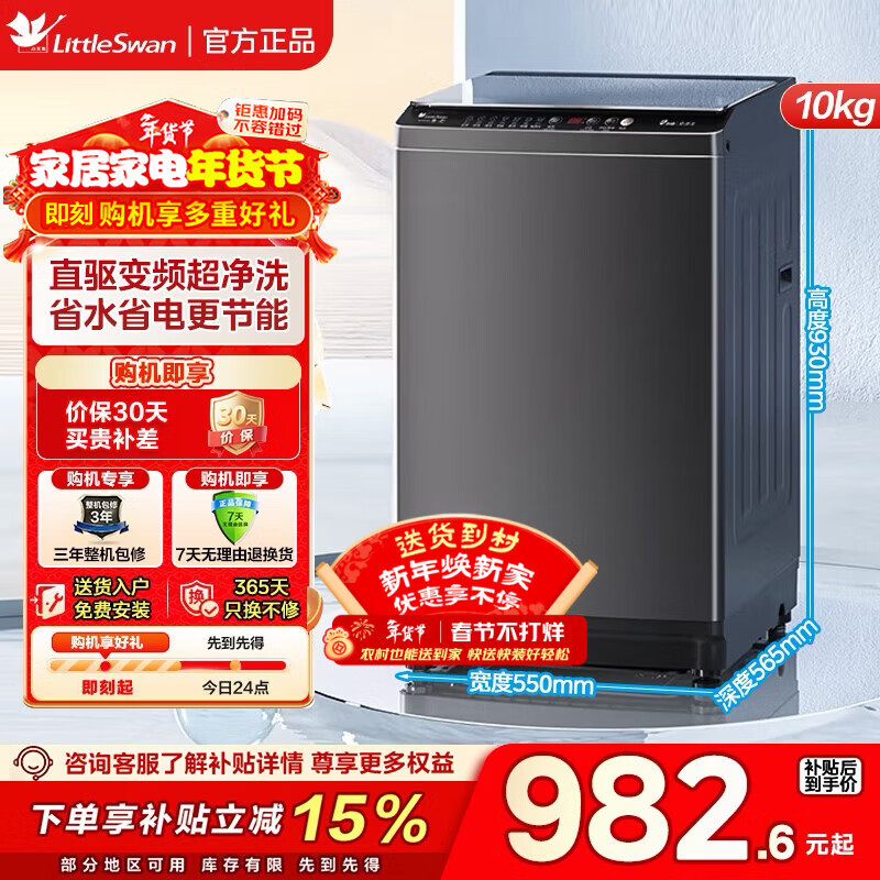 旗舰店小天鹅(LittleSwan)波轮洗衣机全自动 一级能效 除菌螨大容量 升级鲸浪柔洗 免清洗不脏桶 以旧换新租房神器 升级泡泡净变频超净漩瀑洗智能洗26DT 波轮 10kg 除螨免清洗