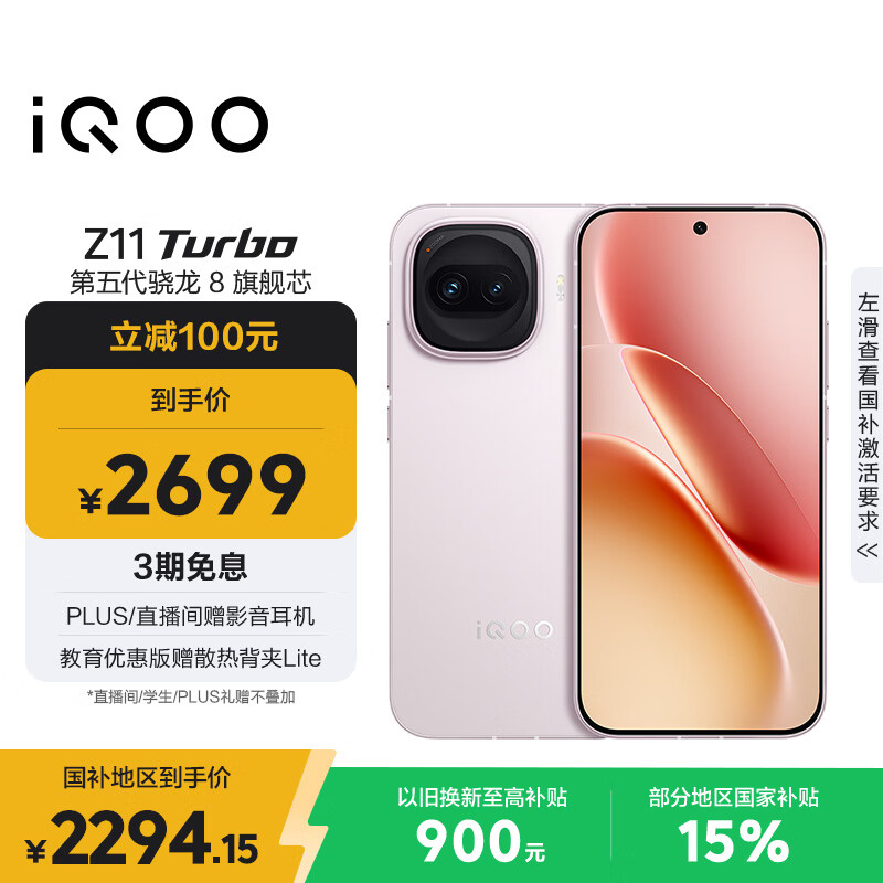 自营vivo iQOO Z11 Turbo 12GB+256GB 光晕粉骁龙8Gen5 自研电竞芯片Q2 2亿大底超级主摄 学生游戏手机