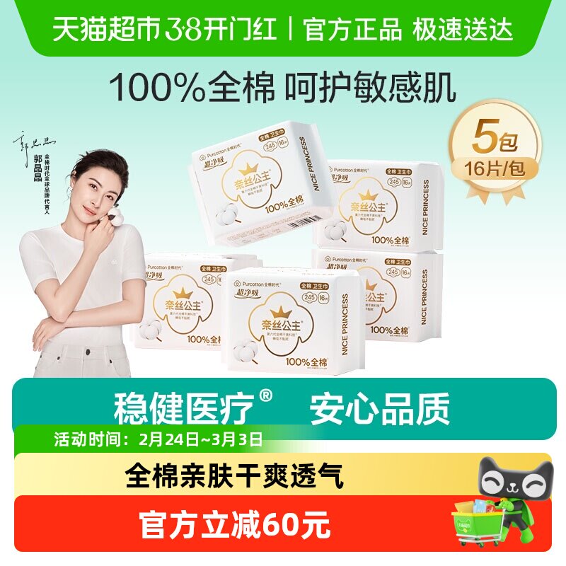 全棉时代奈丝公主卫生巾全棉表层日用超薄亲肤姨妈巾245mm