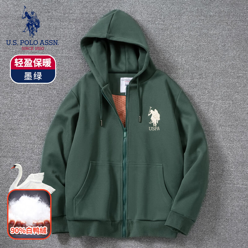 U.S. POLO ASSN.保罗开衫羽绒卫衣男士连帽春秋季上衣百搭纯色青年拉链外套男装 墨绿 XL