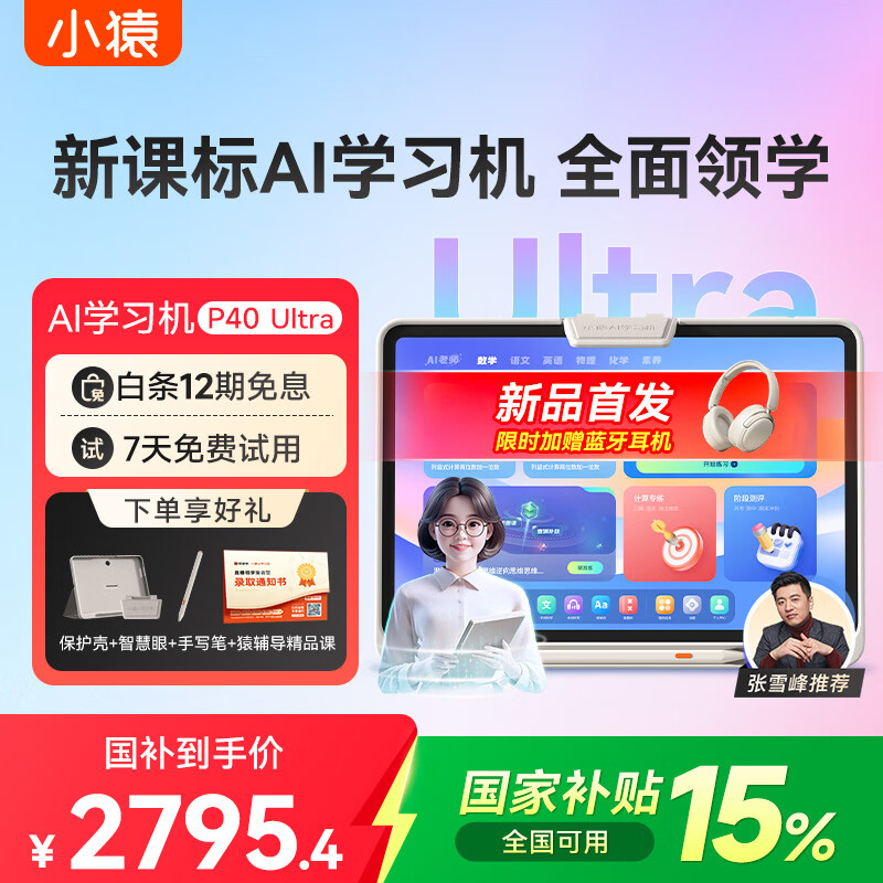 小猿AI学习机P40Ultra 猿辅导学生平板12.3英寸护眼屏 全场景作业辅导 学练一体机电脑 小初高全科 【国补爆款】P40 Ultra 8+256G