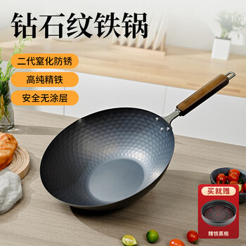 神田日本窒化家用铁锅老式无涂层物理不粘锅中式精铁炒锅炒菜锅煎锅 钻石纹无锅耳(含锅盖) 30cm