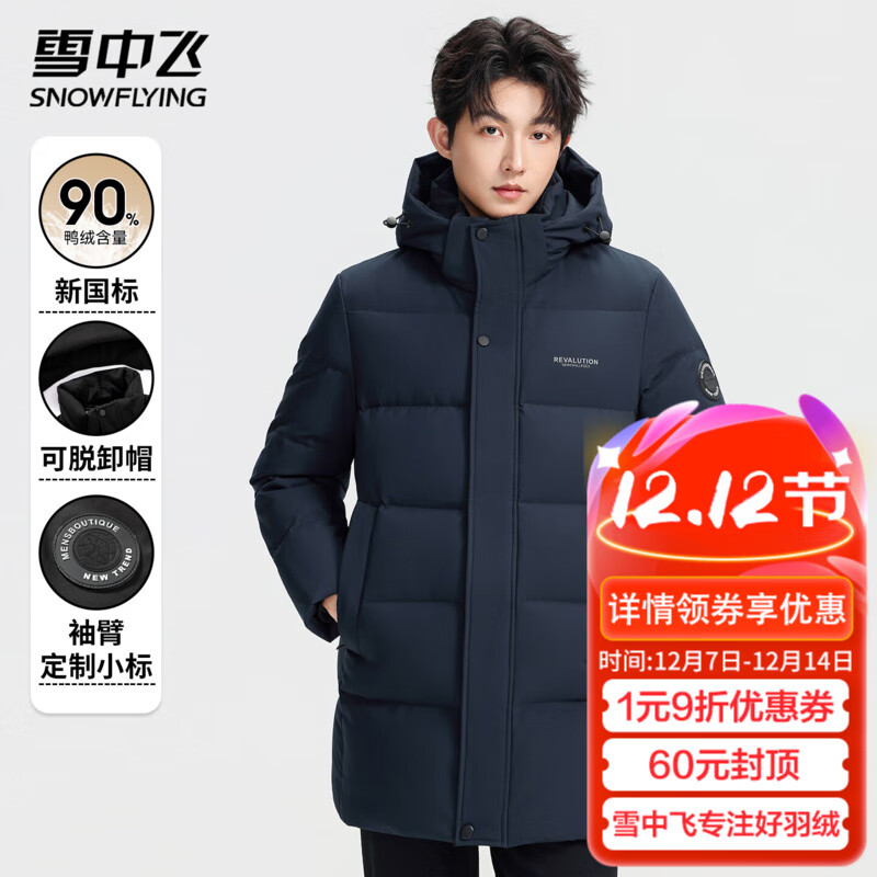 雪中飞冬季中长款羽绒服男经典上衣时尚保暖防寒羽绒衣简约纯色户外外套 黯青色 M (170)