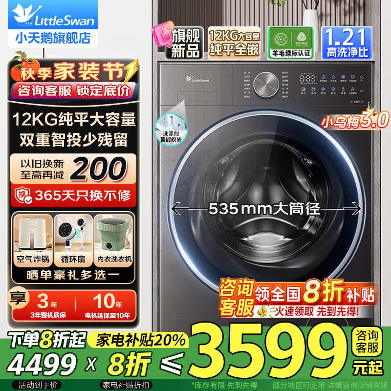 小天鹅(LittleSwan)洗衣机小钢炮/小乌梅3.0全自动洗脱/洗烘一体滚筒10公斤大容量超微浸泡超薄全嵌1.1洗净比以旧换新 12容量新品3.0非烘干|双智投1.21洗净